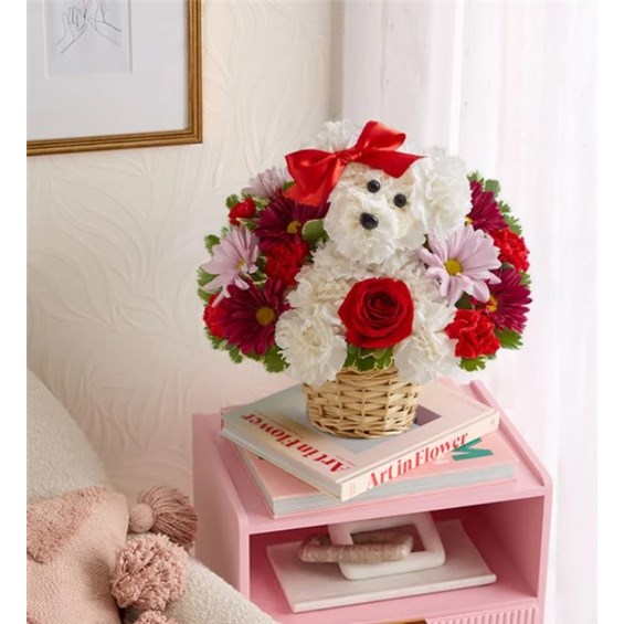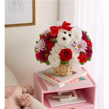 EXCLUSIVE Talk about puppy love! Crafted from lasting white carnations, our canine cutie is sitting pretty in a dog bed basket, surrounded by a mix of red, lavender and purple blooms. The perfect pick to spark romance or celebrate a special relationship.