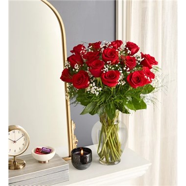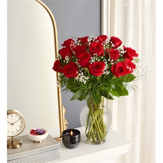 Our premium long stem red roses are an elegant surprise for the one you can trust, the one you can turn to, the one you love with all your heart. Beautifully arranged by our expert florists with lush greenery inside a classic glass vase, 12 or 18 radiant blooms are hand-delivered and ready to delight them for any romantic reason.