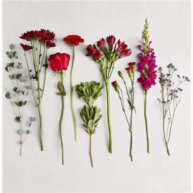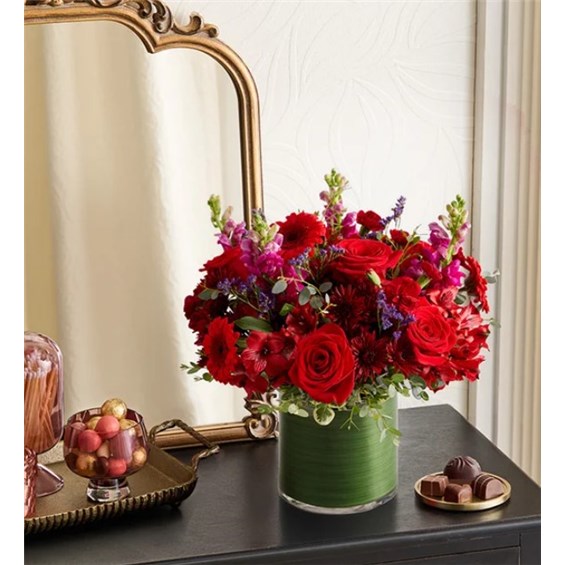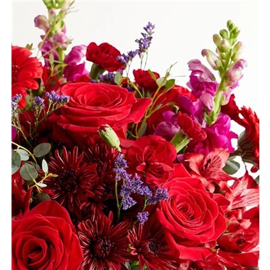 NEW Send a bouquet as bountiful and majestic as your love. Roses, Peruvian lilies, snapdragons, and other blooms in rich red and purple hues make a sweeping, dramatic statement and prove just how eloquent flowers can be.